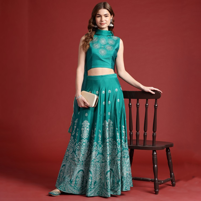 Lehenga Fabric : Polyester Blouse Fabric : Polyester Dupatta Fabric : Poly Crepe Ornamentation : Gotta Patti Lehenga Closure : Zip Hemline : Flared Neck : Boat Neck Sleeve Length : Sleeveless